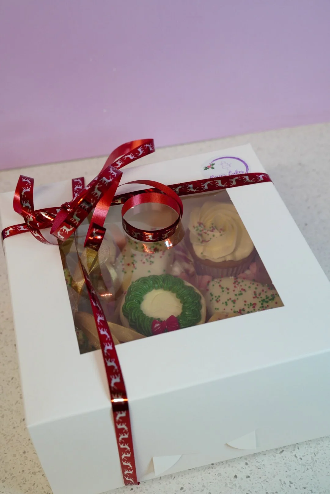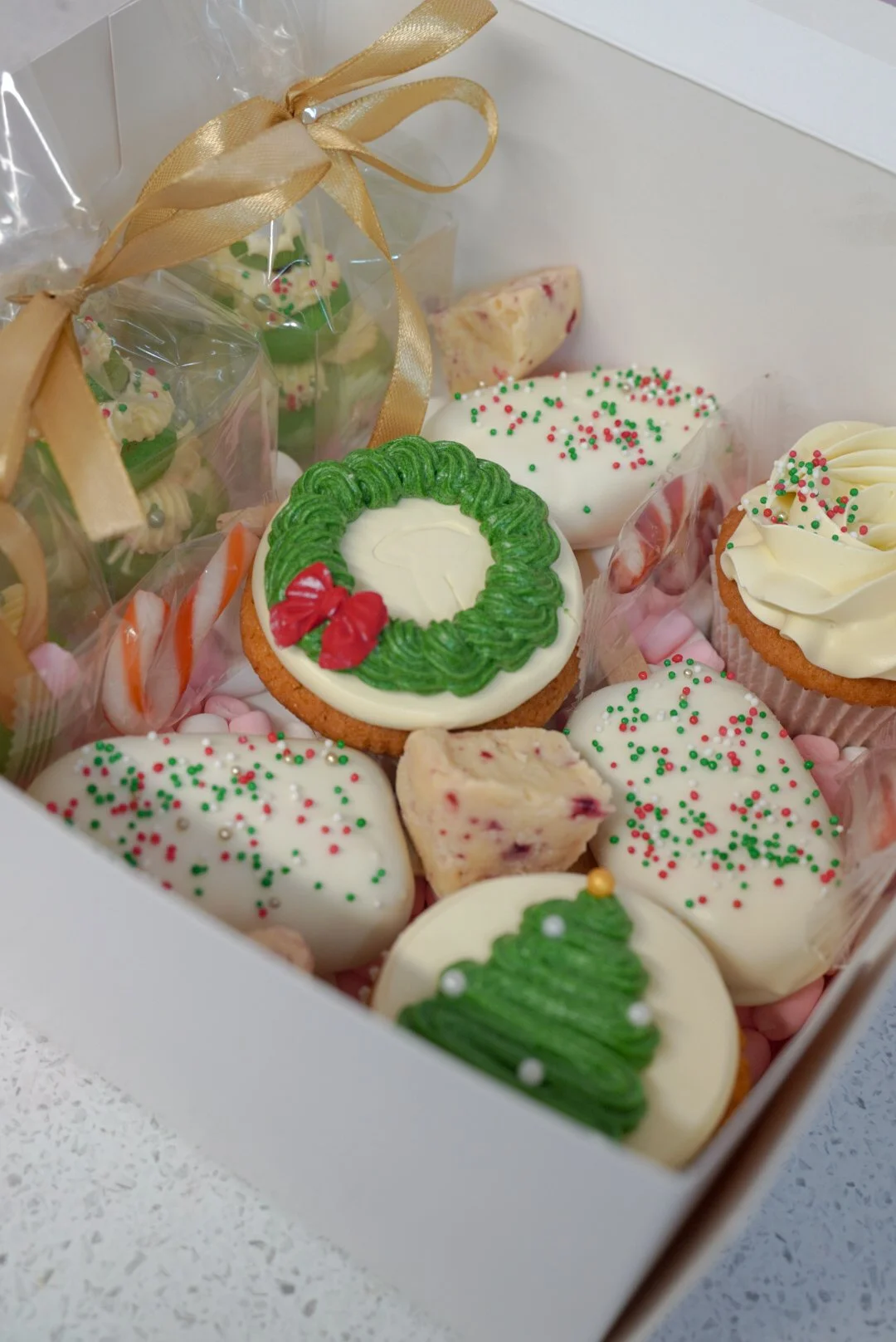 A selection of Christmas themed goodies such as cupcakes, macarons, brownie, fudge etc.