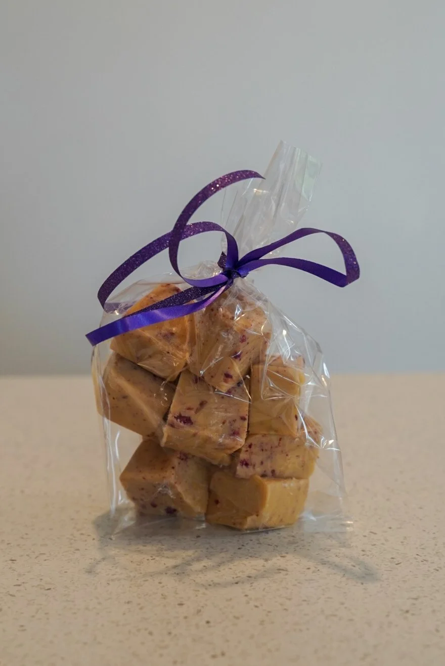 10 pieces of delicious raspberry and white chocolate fudge.